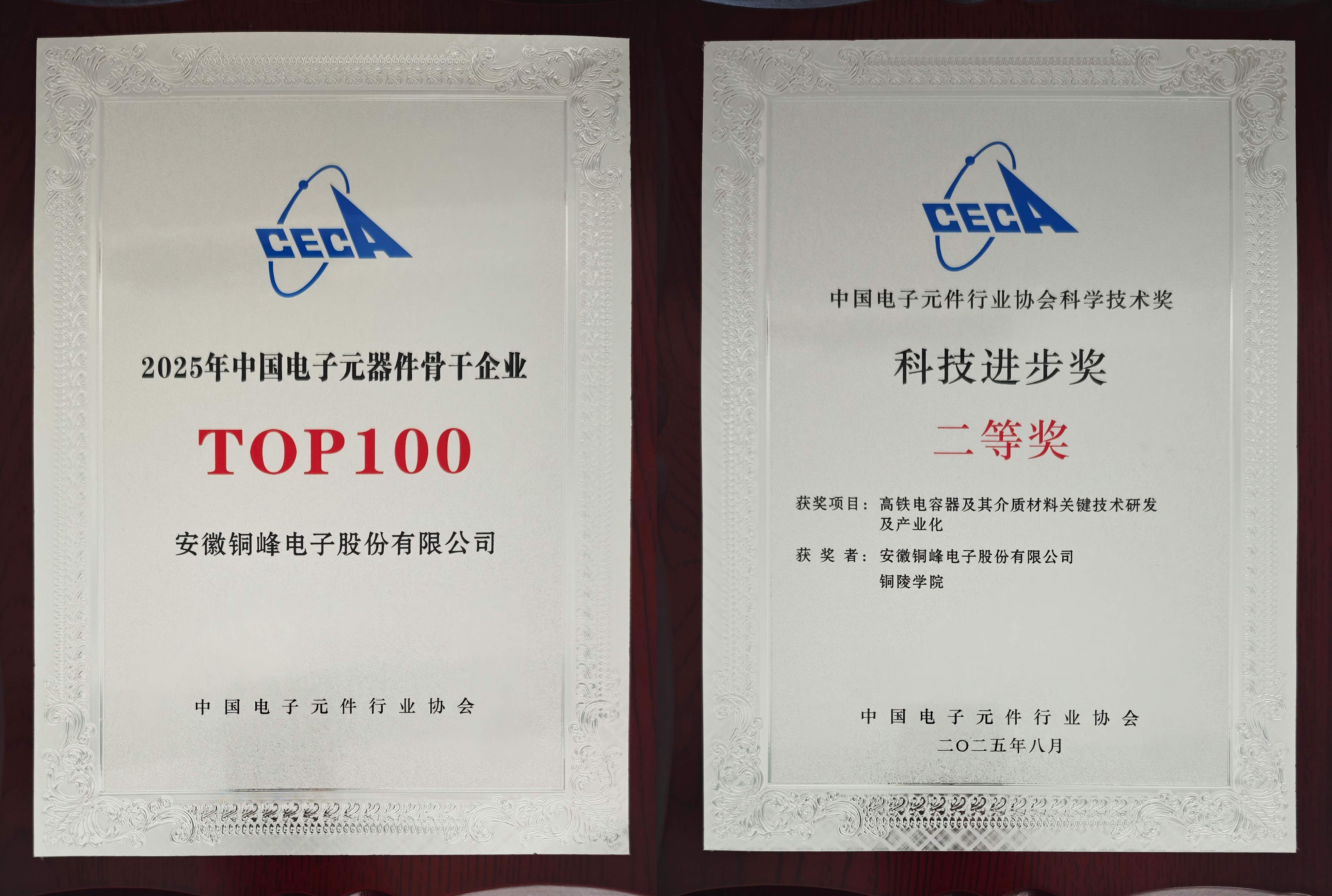 會議過程中,除舉辦主題演講、高端對話、分會平行論壇外,還舉行了2025年中國電子元器件骨干企業(yè)、2025年度(第3屆)中國電子元件行業(yè)協(xié)會科學(xué)技術(shù)獎頒獎儀式,公司連續(xù)三十余屆獲評“中國電子元器件骨干行業(yè)TOP100 ”榮譽(yù),并榮獲中電元協(xié)科技進(jìn)步二等獎。